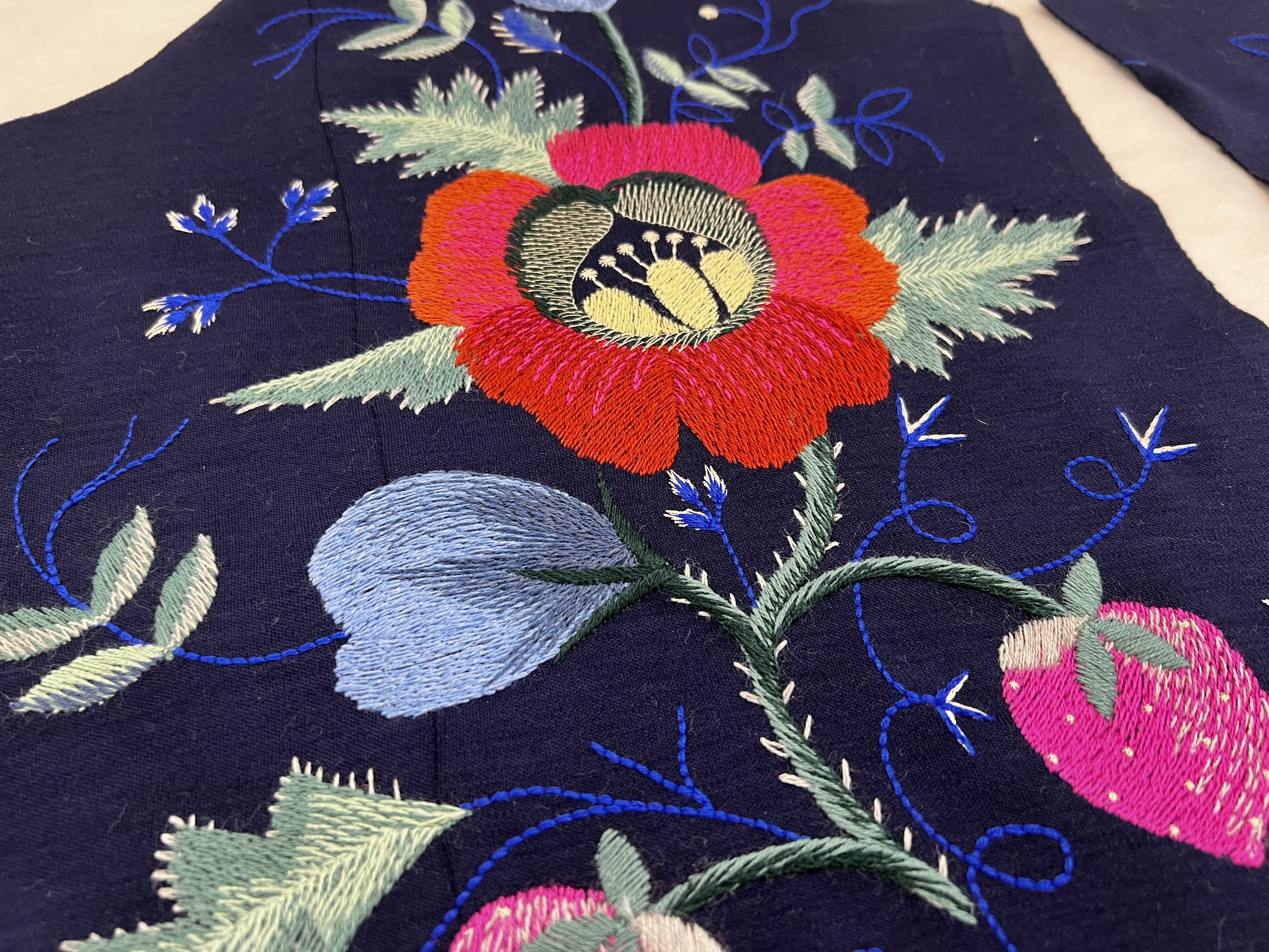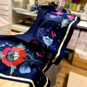 Koostöös Katrin Kuldma’ga valminud tikand Villaste lõngadega valminud Muhu ainetel tikand meie esileedi Sirje Karise jakile. Idee autor: Katrin Kuldma.